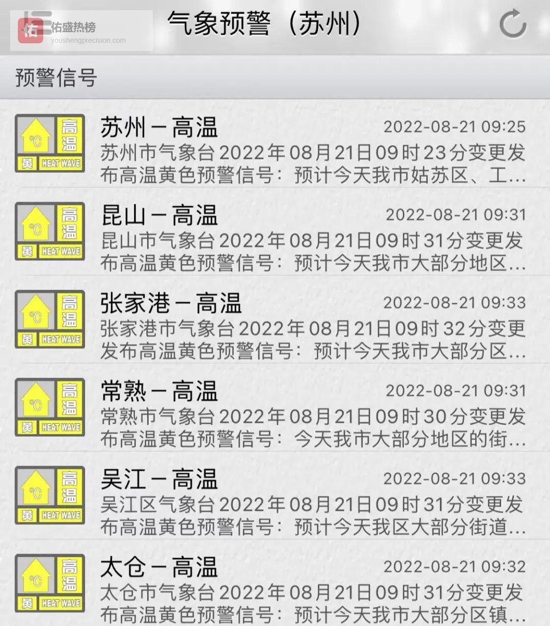 常熟市气象台高温黄色预警信号高挂,预计到8月23日,全市仍将持续晴热高温,极端最高气温可达39~40℃。今天和24日午后到夜里,局部地区将出现雷阵雨,雷暴大风可达8~10级,短时强降雨突如其来,外出务必带好雨具并注意防风防雷电。