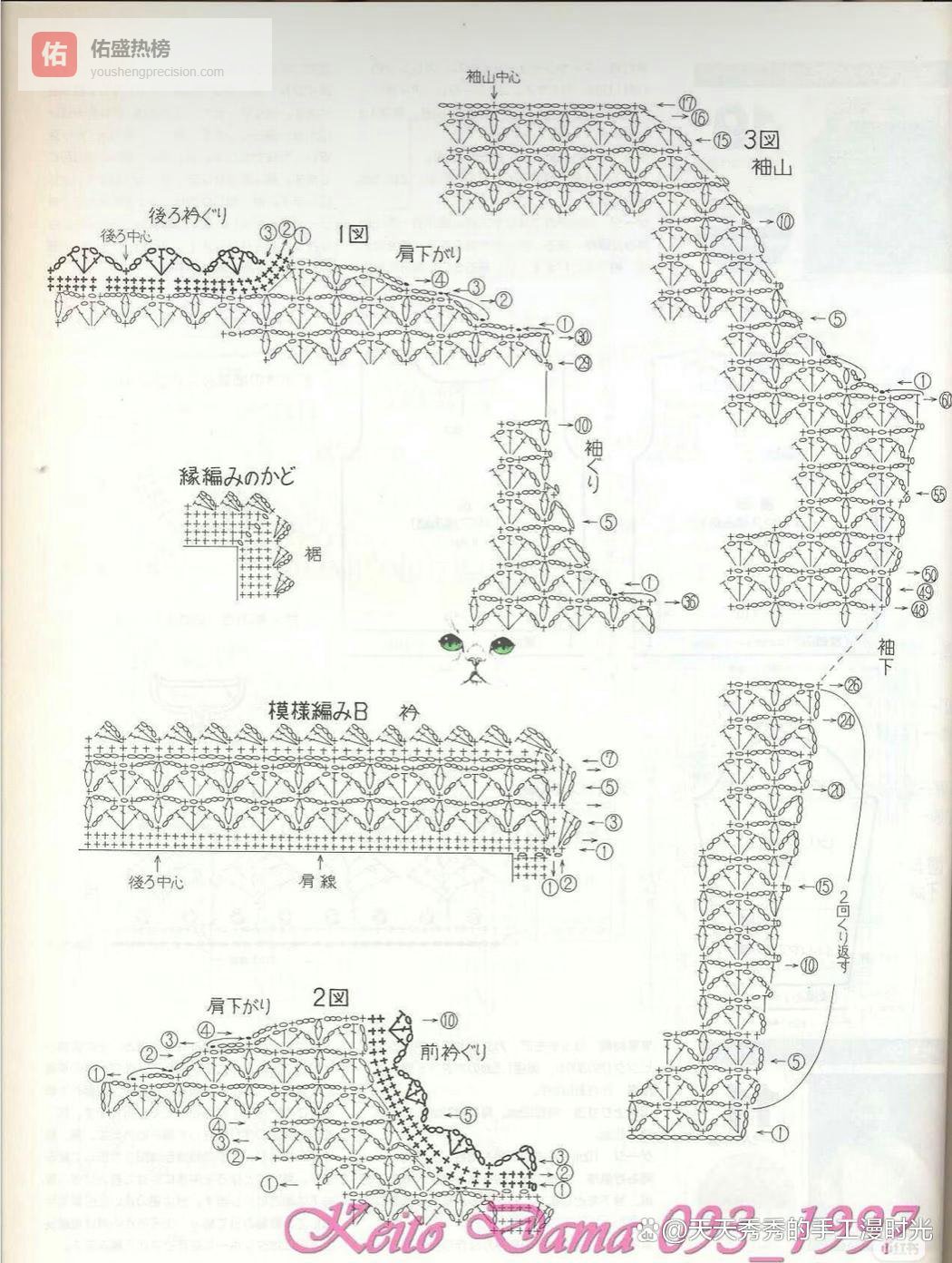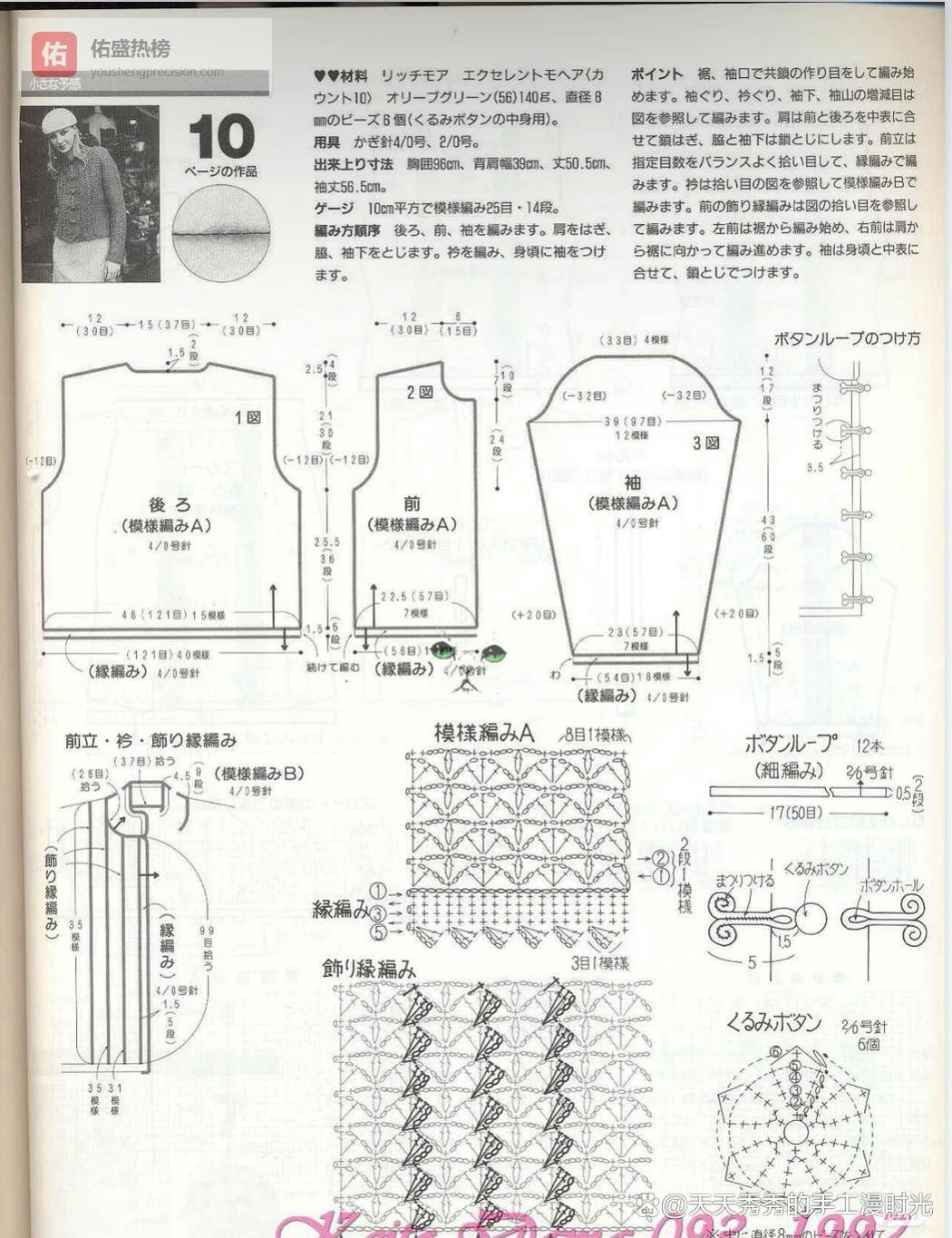 分享打动我的手工作品,希望能同样打动你,并给你带去手工的无限乐趣和无穷魅力。这款作品是一款以马海毛为主要材质的女士短款钩针开衫,整体设计充满轻盈柔和的质感,仿佛能捕捉到春日的微风与阳光。它采用了独特的菱形网格花样编织,使得衣身既通透又富有结构感,同时马海毛的蓬松感又为这件开衫增添了温暖与柔软。前襟处的盘扣设计是点睛之笔,不仅方便穿脱,更赋予了这件开衫一丝复古与雅致的东方韵味。开衫的整体版型宽松舒适,短款设计能够很好地优化身材比例,搭配半身裙或牛仔裤都十分出彩,无论是日常通勤还是周末出游,都能轻松驾驭。成品尺寸为胸围96cm、背肩幅39cm、衣长50.5cm、袖长56.5cm,适中的尺寸适合大多数身形,是一件兼具美观与实用性的手工作品。难度级别:四星方法说明:采用钩针网格花样编织法、锁针、短针、长针、引拔针等基础钩织技法,使用4/0号、2/0号钩针,通过分片钩织、花样拼接、盘扣制作等步骤完成作品。图解来源网络,整理存解自用。材料准备、图解及方法说明:1. 材料与工具(1)线材:Richmore Excellent Mohair(10)毛线,具体色号及用量如下:① 橄榄绿色(56):140g② 直径8mm的珠子6个(用于制作盘扣)(2)工具:① 钩针:4/0号、2/0号各1枚② 其他:缝合针1根,剪刀1把2. 成品尺寸(1)胸围:96cm(2)背肩幅:39cm(3)衣长:50.5cm(4)袖长:56.5cm3. 编织步骤(1)后片:使用4/0号钩针,按花样A从下摆开始起针钩织,完成主体部分,注意按图示进行减针以形成肩部弧度。(2)前片:使用4/0号钩针,按花样A分别钩织左右前片,前襟处按图示预留出盘扣袢的位置。(3)袖子:使用4/0号钩针,按花样A从袖口开始起针钩织,逐步加针至袖山,注意袖山处的减针处理。(4)前襟、领口与装饰边:使用4/0号钩针,按花样B沿前襟、领口和下摆钩织装饰边,使其与主体花样呼应。(5)盘扣制作:使用2/0号钩针,用细毛线钩织12根细带,再将珠子与细带组合,制作成6个盘扣。(6)缝合与整理:将后片、前片、袖子在肩部和侧缝处进行缝合,然后将盘扣缝在前襟对应的位置,整理线头。制作注意事项:(1)马海毛线质地轻盈但容易起毛,钩织时动作要轻柔,避免线材打结或受损。(2)花样A和花样B的针数和行数要严格按照图解,确保衣身各部分尺寸准确,拼接后平整。(3)前襟和领口的装饰边钩织时,要注意与衣身的针数对应,避免出现扭曲或不平整。(4)盘扣的制作要牢固,珠子的位置要对称,确保开衫闭合后美观且稳固。(5)成品完成后,建议用蒸汽熨斗低温轻烫,使织物更加平整有型,同时恢复马海毛的蓬松感。