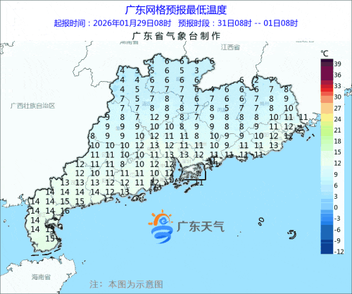 降温方面,预计这次冷空气过程(1月31日-2月2日)日平均气温降幅在3-6℃,过程最低气温出现在2月1日或2月2日早晨,粤北部分市县有5℃以下低温(韶关北部和清远北部),高海拔山区2-4℃,2月3日起气温逐渐回升。