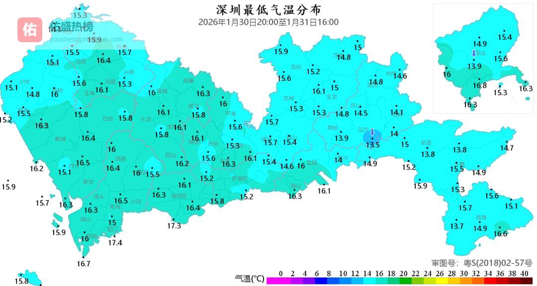 截至16时,全市日最低气温普遍在15-16℃,体感较冷。