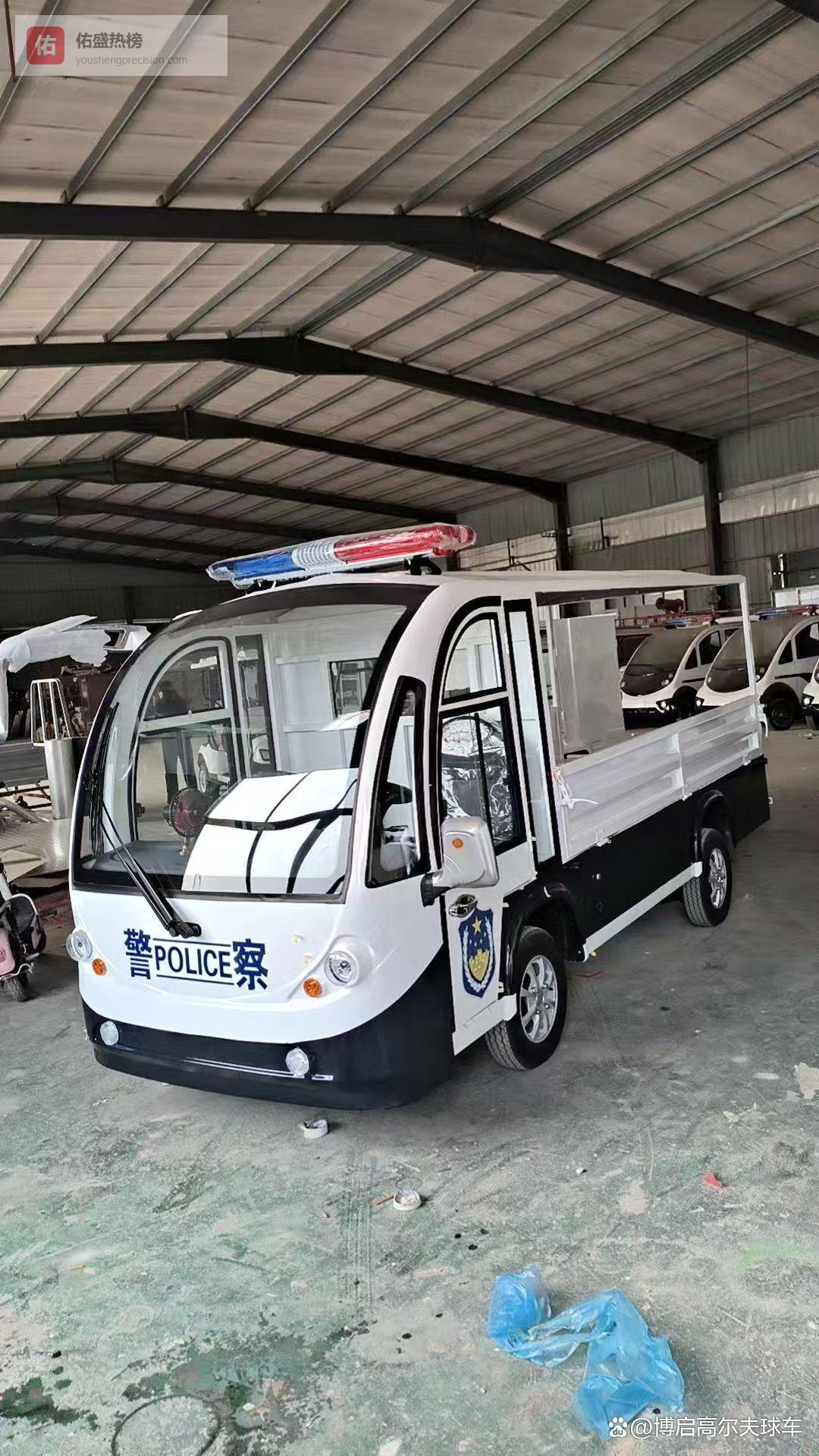 3. 工业园区巡逻车:保障企业安全的实用车型工业园区的电动巡逻车通常更注重载重和耐用性,车身较高且底盘稳固。这类车多为深色系,配备工具箱和消防器材接口,适合在大型厂区内巡逻。图片中可见车辆两侧有明显的反光条,夜晚行驶时警示效果更佳,能有效防范园区安全隐患。