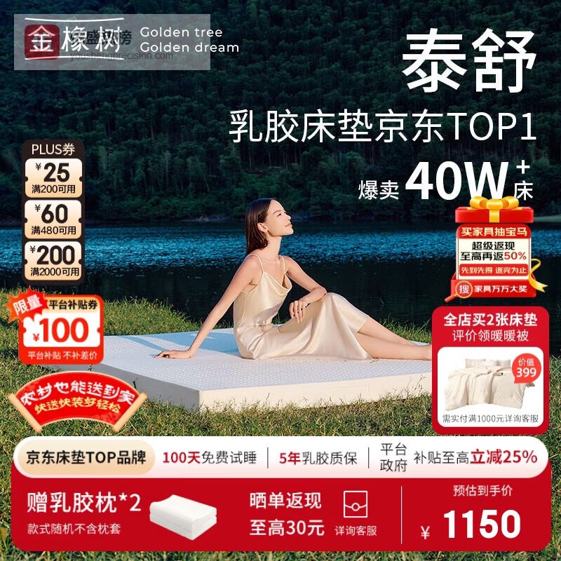 【京东自营】金橡树泰舒天然乳胶床垫泰国进口原液榻榻米双人可定制1.8*2米软硬适中¥