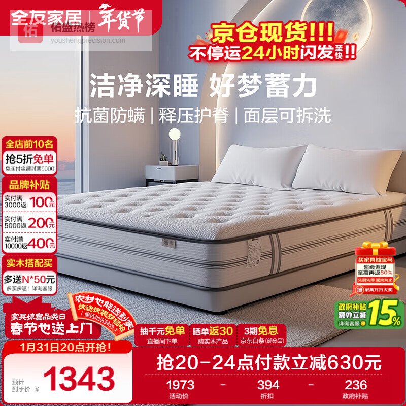 【京东自营】全友家居进口乳胶床垫1.8米x2米双人席梦思厚床垫独立袋装弹簧床垫子¥