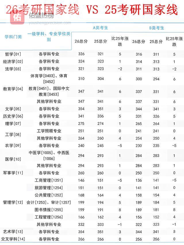 一、先看干货:26/25国家线对比,涨分、降分一目了然