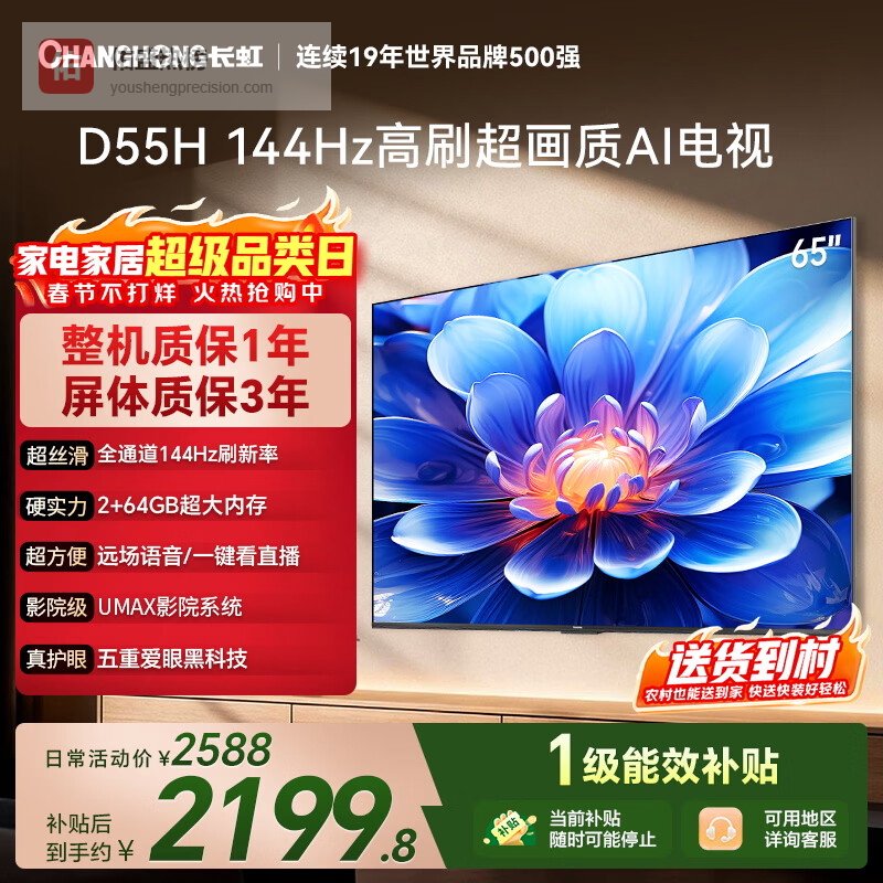 【京东自营】长虹经济款长虹电视55D55H55英寸【包安装】144Hz高刷2+64GB大内存LED液¥