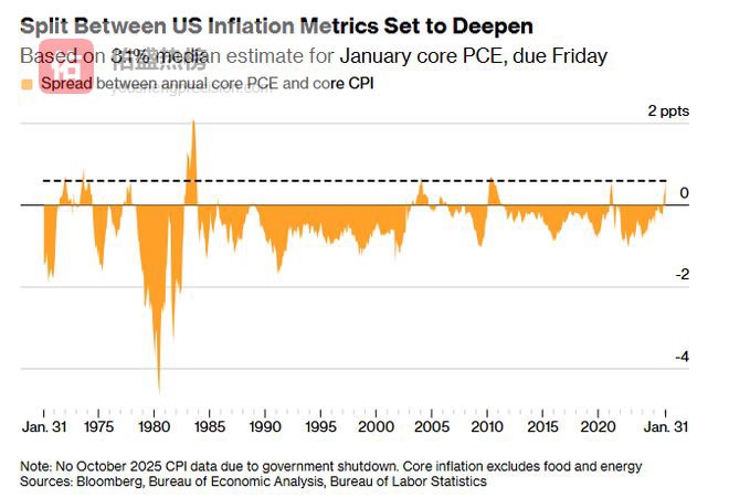 令鸽派人士担忧的是,在2021年通胀开始起飞时,PCE指标其实是先于CPI开始攀升的。如果1月份的核心PCE真如经济学家预测的那样,那么它超过核心CPI的同比幅度,将创下几十年来之最。