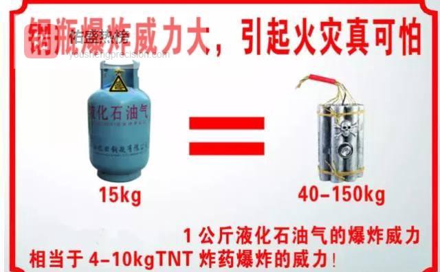 人若吸入这种爆炸性气体,将使呼吸道和肺脏组织烧损,可怕至极。据统计,一罐家用液化气爆炸就相当于约145千克TNT炸药的威力,而一千克TNT炸药差不多能炸毁一栋两层的平房,145千克TNT当量的液化石油气爆炸的威力可想而知。