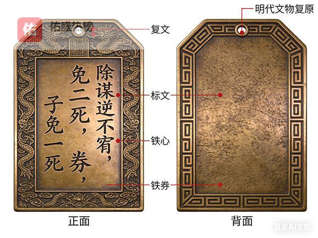 同期颁赐免死铁券,券文明载:除谋逆不宥,其余若犯死罪,尔免二死,子免一死。铁券形如瓦,鎏金嵌字,左颁功臣、右藏内府,为明代最高勋贵凭证。