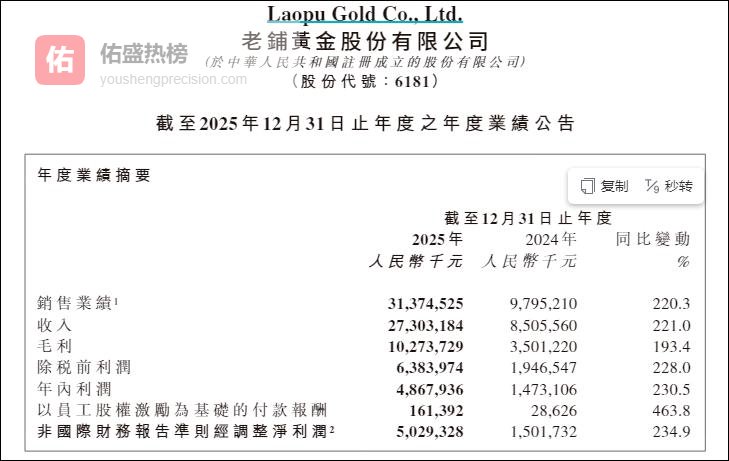 3月23日,黄金一片大跌声中,老铺黄金发布了2025年度业绩报告。