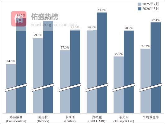 弗若斯特沙利文调研资料显示,老铺黄金消费者与路易威登、爱马仕、卡地亚、宝格丽等国际五大奢侈品牌的消费者平均重合率从2025年7月的77.3%提升至2026年3月的82.4%。财报原文指出,“老铺黄金消费者与国际奢侈品牌人群高度重合,具备高端消费特点,验证了品牌的高端定位。”