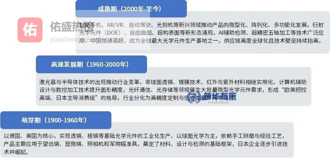 光学元件零组件行业自20世纪初起步,历经三大发展阶段,实现从手工制造到智能化精密制造的跨越式发展。