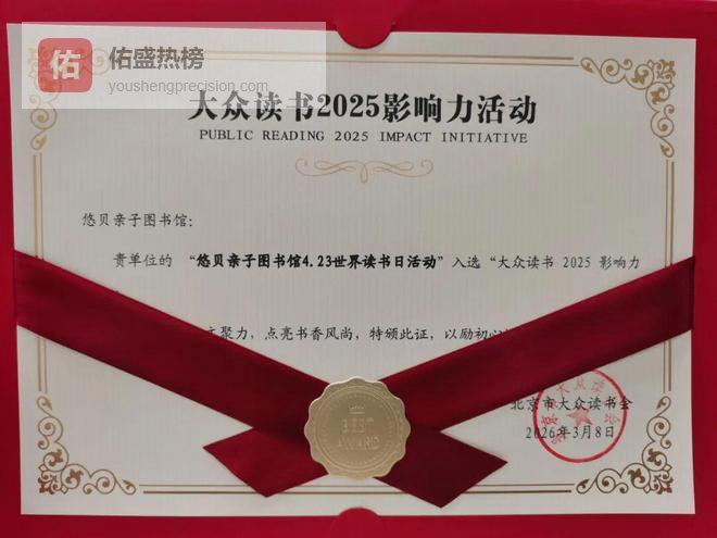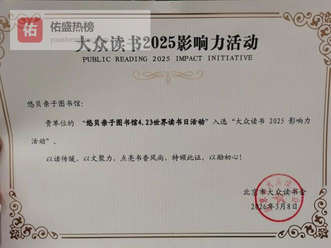近日,悠贝亲子图书馆4.23世界读书日活动入选“大众读书2025影响力活动”,这份证书,是对我们在阅读推广领域持续深耕的又一次鼓励及认可。
