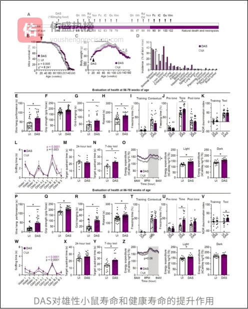 研究人员将20周(相当于人类中青年)的小鼠分为2组,一组在饲料中添加150mg/kg的DAS,另一组作为对照,持续观察,直至自然死亡。