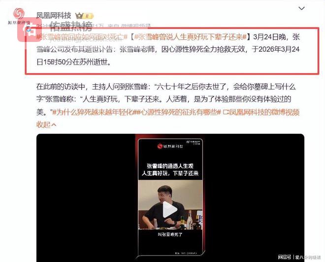 2026年3月24日,知名教育博主张雪峰因心源性猝死在苏州逝世,消息一出震惊全网。