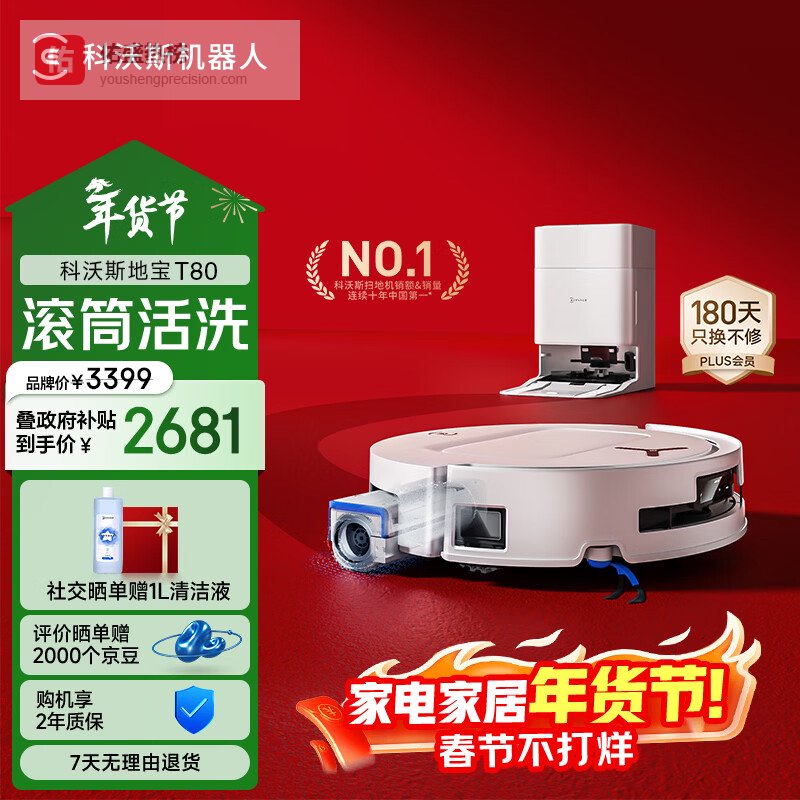 【京东自营】科沃斯T80扫地机器人扫拖洗烘一体自动清洗滚筒洗地机器人智能语音水箱版¥