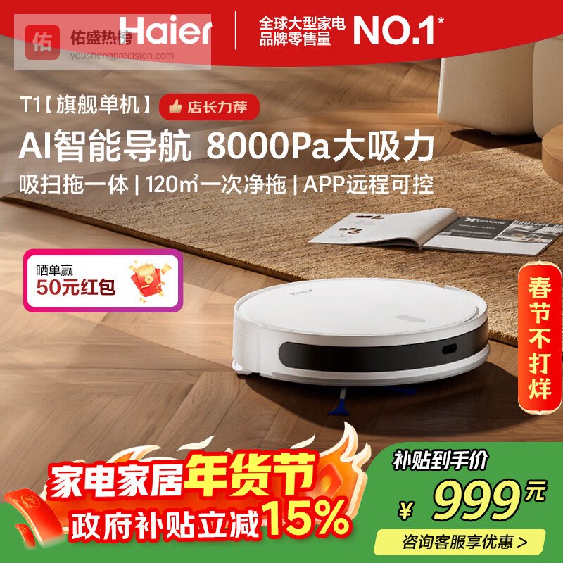 【京东自营】海尔扫地机器人T1扫拖一体自动清洗全自动拖地机洗拖一体机器人擦地拖地机8000Pa大吸力¥