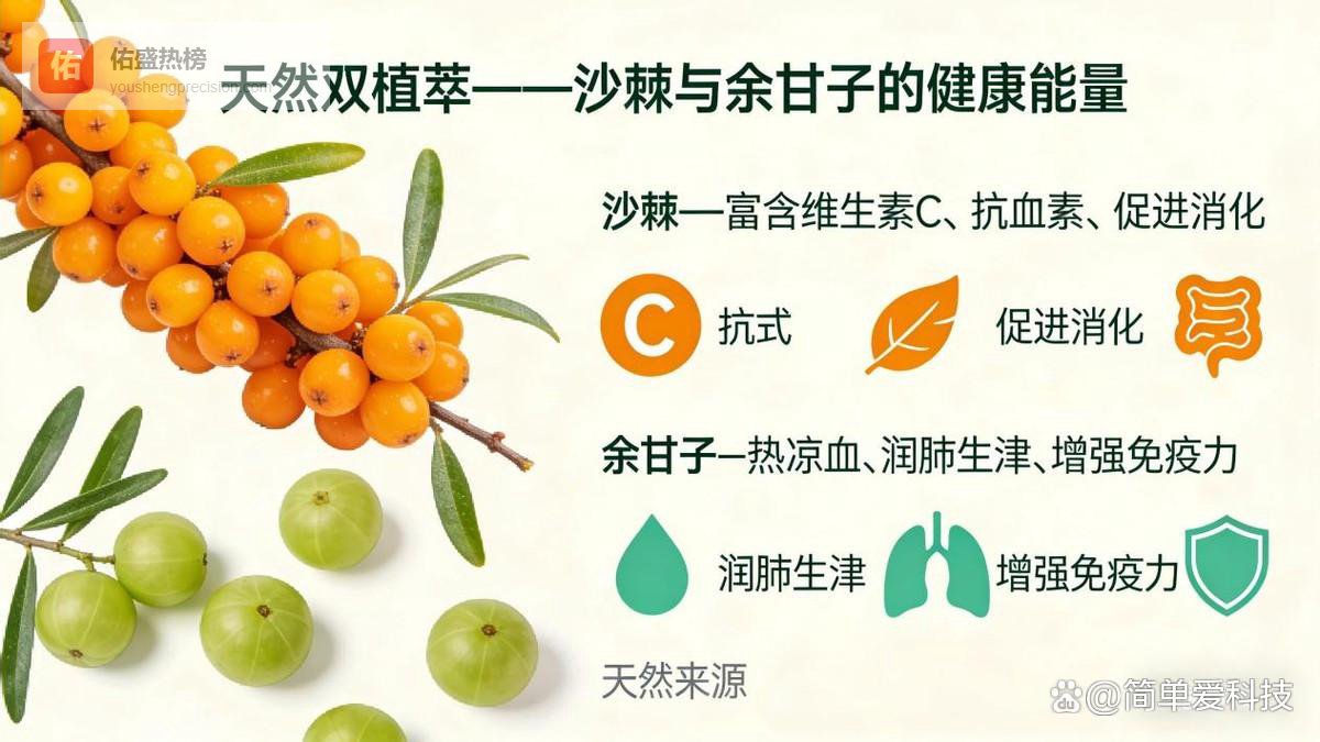 沙棘:被称为“维生素C之王”,其抗氧化能力全面,能协同清除多种自由基,帮助肌肤对抗光老化,改善因氧化应激导致的肤色不均。