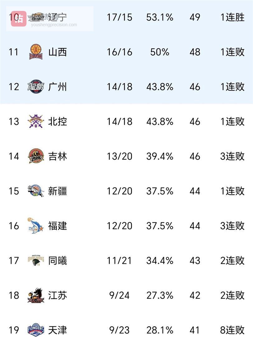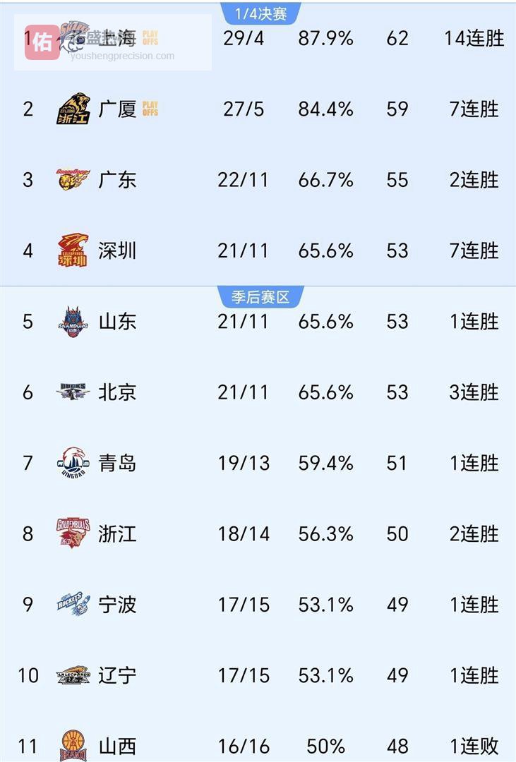 现在积分榜中游简直乱成了一锅粥。 深圳队、山东队和北京队的战绩都是21胜11负,和广东队只差1个胜场。 这意味着广东队这个第三名的位置坐得一点也不稳,后面三支球队虎视眈眈,随时都可能把他拉下来。