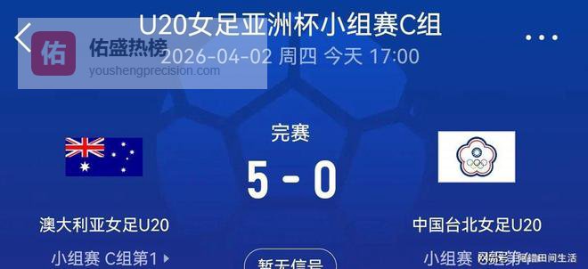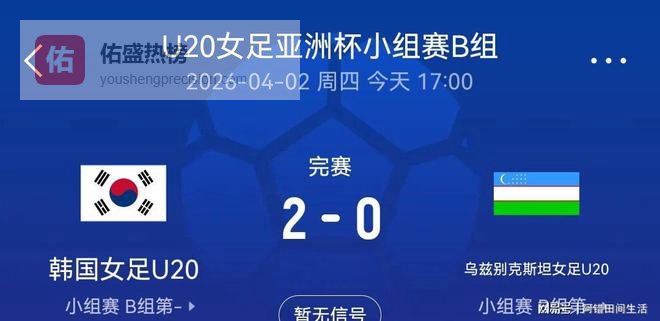 北京时间4月2日17:00,U20女足亚洲杯B组首轮韩国U20女足2-0战胜乌兹别克斯坦U20女足。C组澳大利U20女足酿惨案5-0大胜中国台北U20女足。