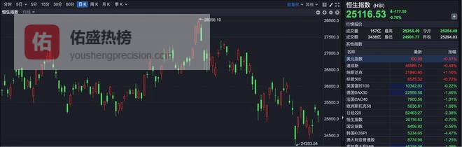 截至收盘,恒生指数报25116.53点,下跌177.50点,跌幅0.70%。