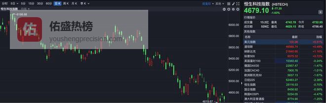 恒生科技指数收盘报4679.10点,下跌77.35点,跌幅1.63%。