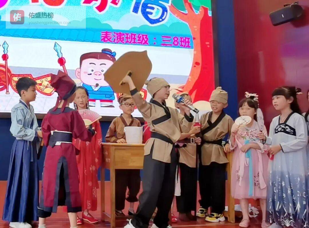 三(5)班用纸糊的“铃”和“耳朵”做道具,把《掩耳盗铃》演得 “信以为真”:小偷偷铃铛,捂住自己的耳朵就以为别人听不见,动作憨态可掬,台下笑声一浪高过一浪。