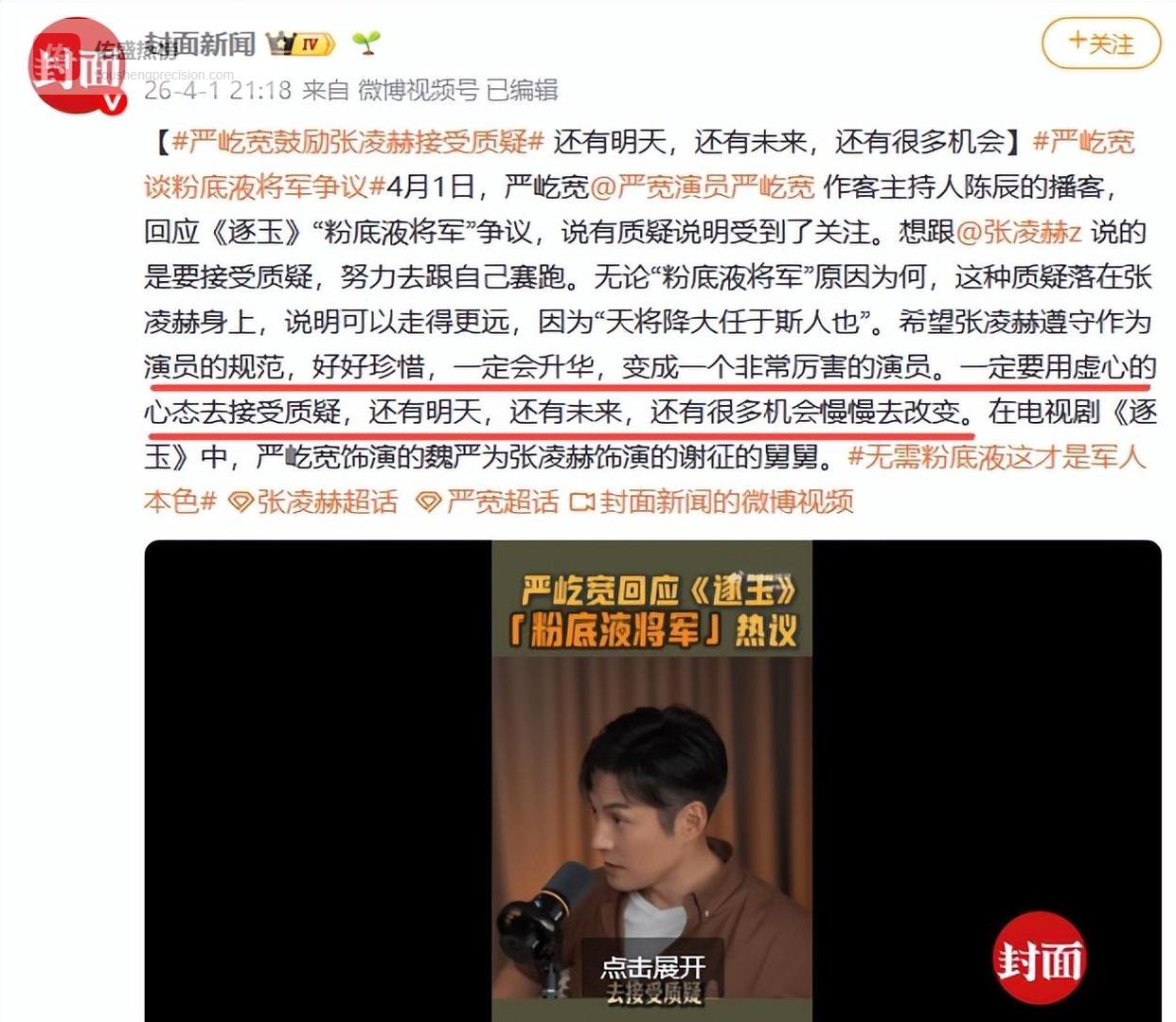 严屹宽谈张凌赫风波:不夸不骂,给“粉底液将军”指了条路?表示有质疑是好事,年轻演员该这么走!