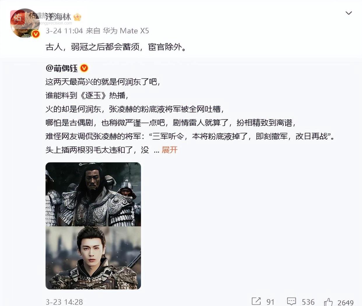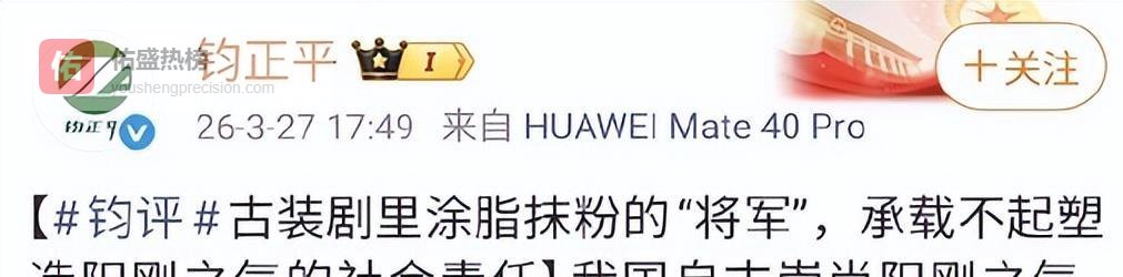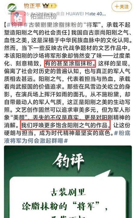 这场玩梗狂欢很快升级为一场关于审美与创作的社会讨论。 3月27日,解放军新闻传播中心旗下的“钧正平工作室”发表评论,直言“古装剧里涂脂抹粉的‘将军’,承载不起塑造阳刚之气的社会责任”。 评论指出,这种过度柔化、刻意精致的呈现,偏离了社会对历史的普遍认知,也与真正的军人气质相去甚远。