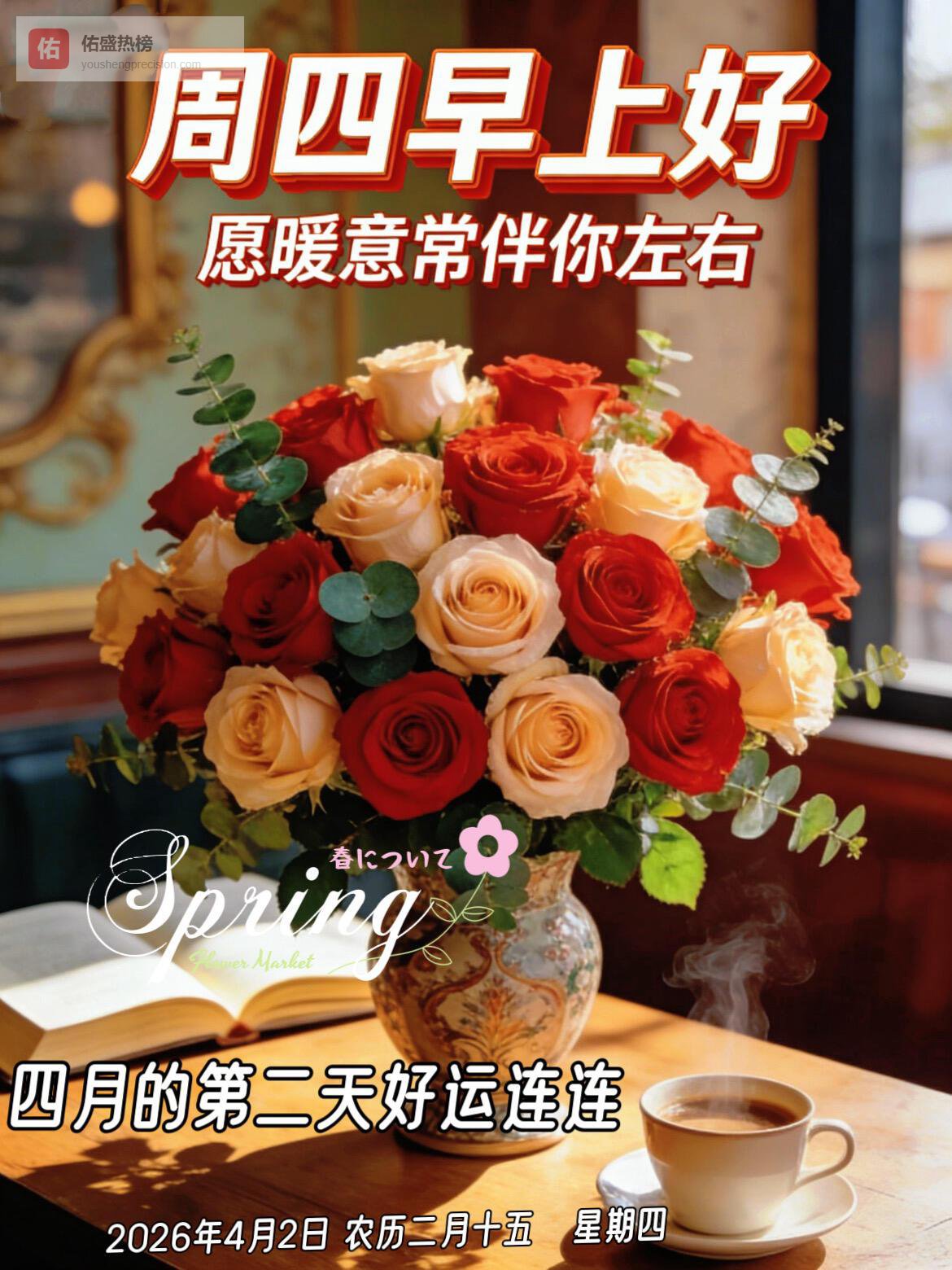 4. 周四已至,时光温柔向前,生活也在慢慢变好。不必焦虑,不必慌张,保持热爱,保持期待,向阳而行,向暖而生。愿你眼里有光,心中有爱,路上有景,身边有暖,所有美好都如约而至,所有幸运都不期而遇,早安。