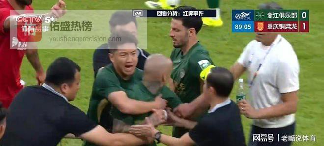 随后比赛节奏加快,身体对抗激烈,浙江队外援米特里策两度揪李镇全头的发被,第一时逃过红牌,第二次VAR介入,主裁判才将他直红罚下。这种行为太恶劣了,主裁判和VAR执法都不及时,导致米特里策才敢于第二次“施暴”。