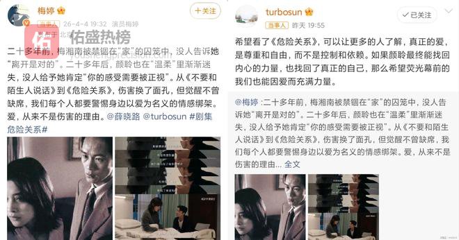 从2001年的《不要和陌生人说话》让全社会第一次大规模正视肢体家暴,到2026年的《危险关系》让大众看清精神控制的真相,两部出自同一位编剧的作品,完成了一场跨越25年的反家暴叙事接力,而梅婷和孙俪的隔空对话,更是给这场接力赋予了更厚重的意义。25年前梅湘南的反抗告诉女性,面对暴力逃跑不是懦弱,反抗永远光荣,25年后颜聆的觉醒告诉女性,只有先看见伤害,才能真正挣脱枷锁。更难得的是,这部剧打破了大家对家暴受害者的刻板印象,孙俪饰演的颜聆是高知大学教授,有独立的事业和清晰的逻辑,却依然会陷入以爱为名的情感陷阱,这也恰恰印证了精神暴力的可怕,它从来无关受害者的学历、收入和社会地位,只会利用人对爱的渴望,一点点瓦解人的判断力。