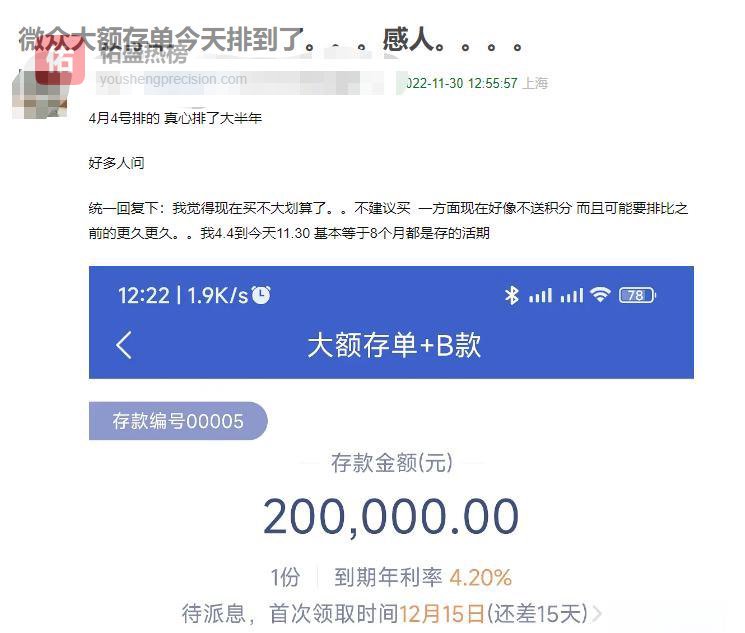 在豆瓣小组里,有人晒出自己的“抢单”史诗:4月4日点下预约键,11月30日才拿到额度,整整8个月。到手的产品是“大额存单+B款”,4.0%月付(到期4.2%),期限却只剩2.8年。