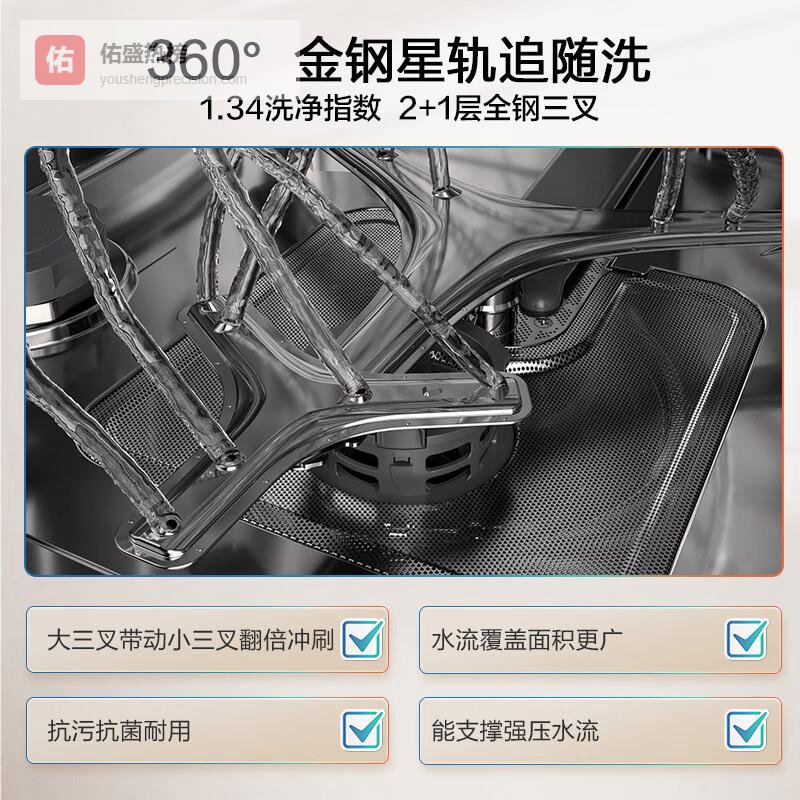高效清洗系统提供强力:金属喷臂与全钢内胆,确保每处餐具都能被彻底清洁,不留死角。