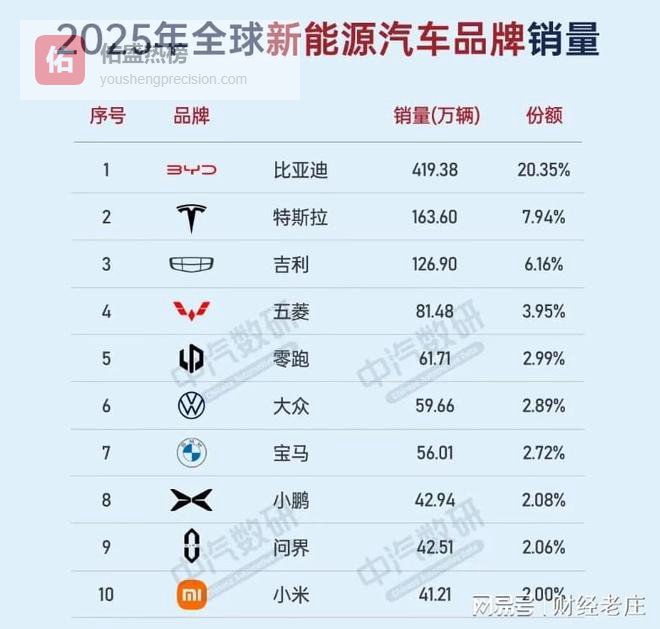 比亚迪2025年销售419.38万辆,全球市场占有率20.35%。比亚迪属于全产业链企业,从电池到智驾系统,都是自研,因此成本控制也是最好的。加上在技术上的断层式领先,比亚迪在全球新能源策划领域,是独树一帜的存在。