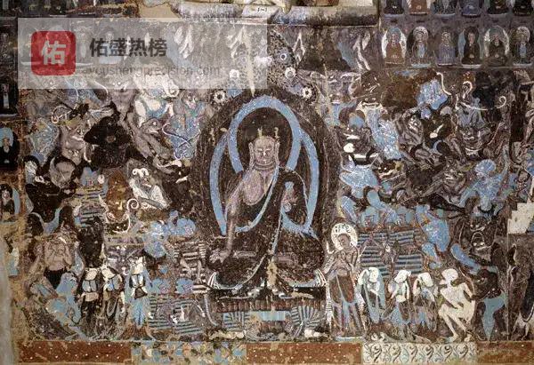 这一铺壁画是进入到这座洞窟的信众观想的起首壁画。人们会看到,在镇定自若、降魔成道的释迦牟尼坐像周围,绘制了很多生动非凡的形象。左右上半部的图像中,各种妖魔鬼怪手持长长的利刃,向释迦牟尼发起了进攻。在画面的左下方,三个美丽妖艳的魔女搔首弄姿,展现出让人无法抵挡的诱惑。而在画面的右下方,对称绘制,表现三个魔女已经变得丑陋不堪,姿态委顿。一具骷髅像伸出长长的舌头,既是哀号,也是最后的示威,可没有用,她们对释迦牟尼的诱惑失败了。