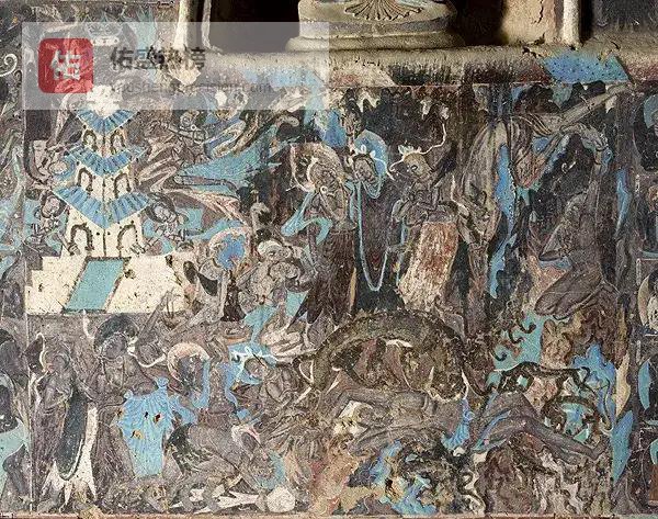 面朝洞窟,开始向左边顺时针行走,在洞窟前室人字披洞顶南壁的一处佛龛的下方,首先映入信众眼帘的是一铺释迦降魔成道图。这一铺属于表现释迦牟尼成佛之前的出生、悟道、成佛和涅槃的佛传故事壁画。这是一铺长方形的壁画,但中部凸起一小块,占据了这面洞壁的大部分空间。在壁画的中心,绘制了释迦牟尼的一尊坐像,这是整幅壁画的中心关注点。人们会瞩目于释迦牟尼神态镇定安详的带背光的坐像,并很快进入到观想的状态,对释迦像的上、下、左、右绘制的各种形态的动感画面进行观想。