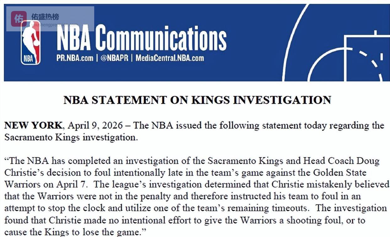2026年4月10日,NBA官方发布了调查结论。联盟声明证实了国王队的说法,调查确认克里斯蒂是误判了比赛阶段,目的是停表叫暂停,并未发现其有故意让国王输球的行为。因此,联盟决定不对国王队处以任何罚款或处罚。