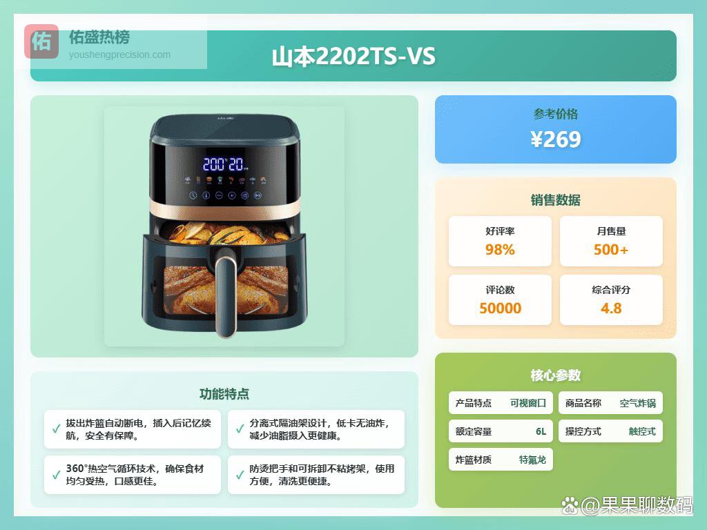 至于山本空气炸锅好用吗?绝对值得买!尤其是现在大家越来越注重健康和环保,而山本的空气炸锅在省电和耐用性上都做得不错。你想啊,一台耐用的空气炸锅,可以用好几年,而且省电的话,长期下来也能省不少电费呢。再加上空气炸这种烹饪方式,确实更健康,对咱们这种既想享受美食又怕长胖的人来说,简直是福音。2026年该怎么选呢?下面给大家挑了6款,感兴趣的可以了解下。