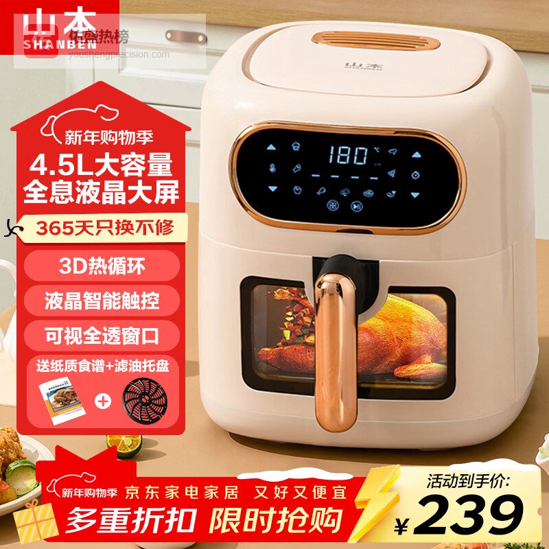 山本(SHANBEN) 空气炸锅 4.5L大容量智能家用多功能全自动煎炸锅无油低脂电炸锅薯条机烤箱 6869TS-VS 4.5L¥