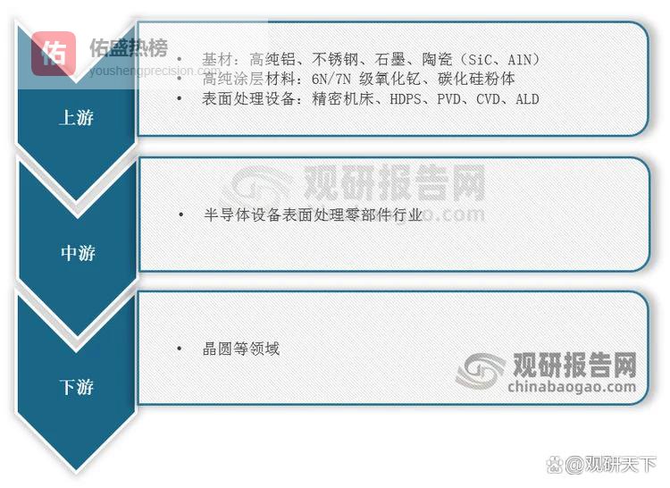 同时,我国半导体设备表面处理零部件行业呈现清晰的三级产业链结构。上游为原料与设备环节,整体具备高壁垒且对进口依赖度较高,其中基材主要包括高纯铝、不锈钢、石墨及SiC、AlN等陶瓷材料,目前国产技术已逐步实现突破;高纯涂层材料以6N/7N级氧化钇、碳化硅粉体为核心,长期由日、美、德企业垄断;表面处理设备涵盖精密机床、HDPS、PVD、CVD及ALD等,高端设备仍高度依赖进口。