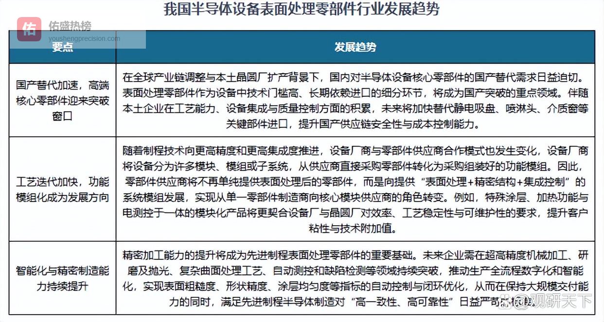 展望未来,我国半导体设备表面处理零部件行业发展趋势如下:工艺迭代加快,功能模组化成为发展方向,智能化与精密制造能力持续提升,国产替代加速,高端核心零部件迎来突破窗口。