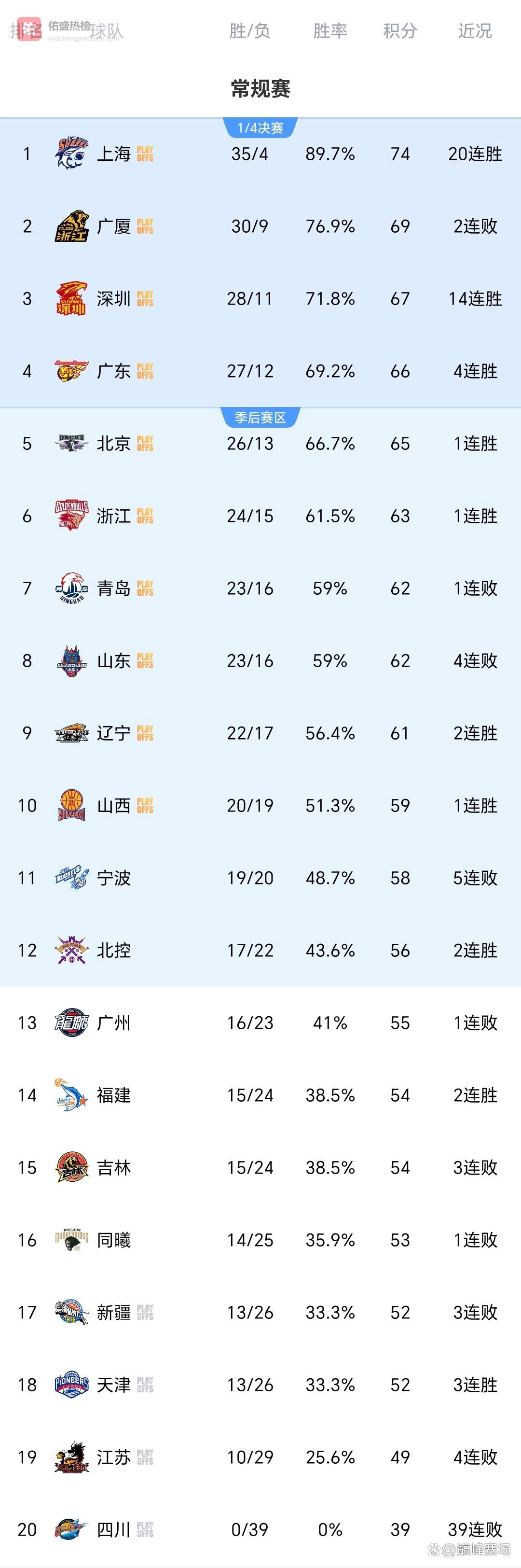 根据积分榜显示,上海久事队以34胜4负的战绩高居榜首,已经提前锁定了常规赛冠军。 浙江广厦队排名第二,广东东阳光队位列第三,北京北汽队排在第四,深圳马可波罗队位居第五。 刚刚赢球的浙江稠州金租队升至第六,青岛崂山啤酒队和山东高速队分列第七和第八位。 辽宁本钢队排名第九。