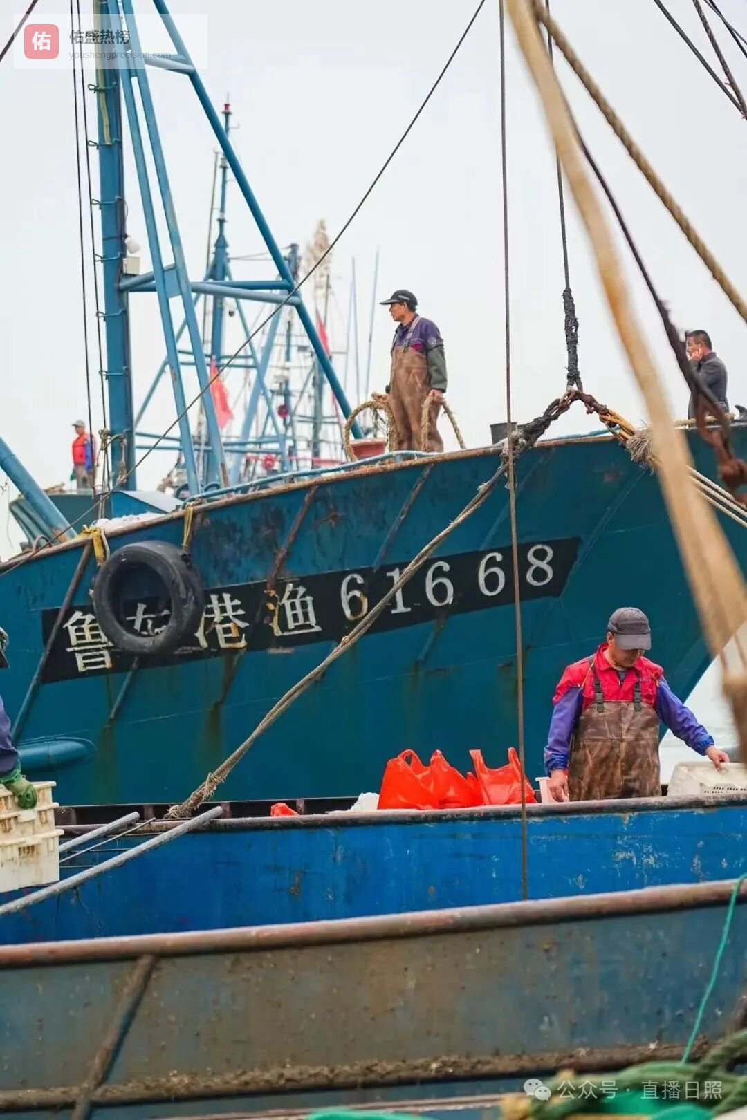 刚靠岸的渔船甲板上