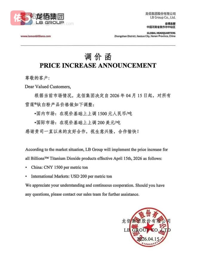 当前,钛白粉行业上游成本压力依然突出——原料价格大幅波动、供应链持续偏紧,叠加产能过剩这一结构性矛盾,行业整体竞争态势短期内难以根本性缓解。在此背景之下,2026年以来,龙佰集团已先后于3月2日、16日、24日三次上调钛白粉产品价格,国内市场累计涨幅达2000元/吨,国际市场累计上调300至350美元/吨,带动超过25家同行企业集中跟进。