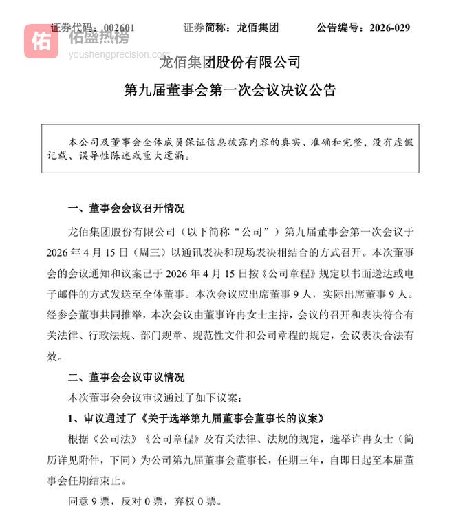 4月15日,龙佰集团股份有限公司(002601.SZ,以下简称“龙佰集团”或“公司”)发布第九届董事会第一次会议决议公告,宣布公司实控人、原副董事长许冉当选为新任董事长,接替任期三年届满的和奔流。