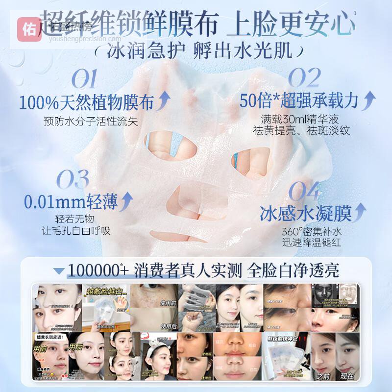 高效补水保湿:结合深层保湿技术,给肌肤带来持续的水润体验。透明质酸钠与芍药根等成分,共同作用让肌肤充满弹性,抚平细纹。使用后的清爽感,再搭配轻薄隐形设计,使面膜完全贴合面部轮廓,避免了传统厚重面膜的束缚感。这样创新的设计提升了精华的吸收,让日常保养变得更加有效,让每一次护肤都如浸泡在甘露之中,滋养无比。