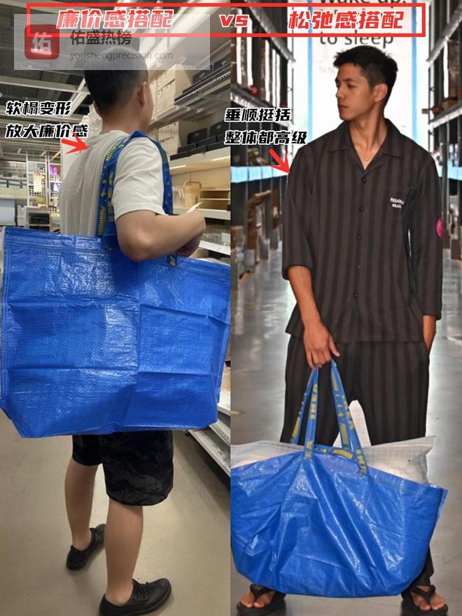 你会发现,很多你觉得好看的宜家袋子博主图,都是主打的“质感对比”。宜家袋的材质是硬挺的塑料感,这种材质与蓬松的毛毛外套、细腻的丝绸衬衫或粗犷的牛仔面料碰撞时,会产生极佳的时尚火花。