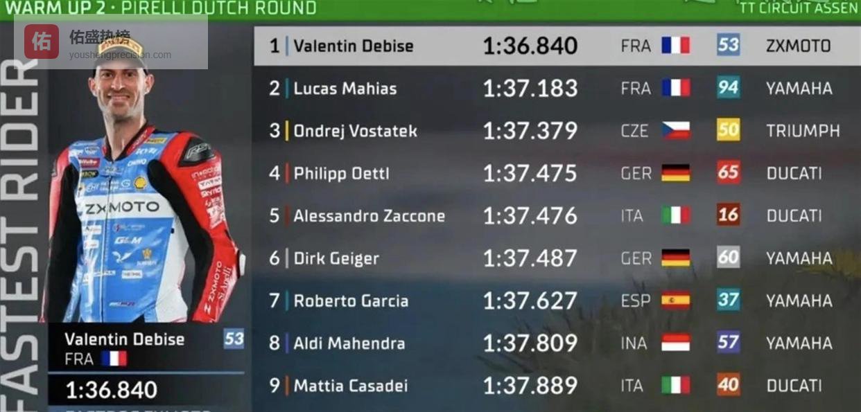 到了今天的热身赛,德比斯把状态调整到了满格。 1分36秒840,直接拿下热身赛第一。 这个成绩比前一天热身赛的1分36秒910还要快,硬生生把日本的雅马哈、英国的凯旋、意大利的杜卡迪全部甩在身后。 热身赛虽然不计入正赛积分,但它传递的信号非常明确——张雪机车不是来玩的,是来干翻所有人的。 两天之内连续两场热身赛都是第一,这种统治力摆在那里,对手再怎么针对也没用。