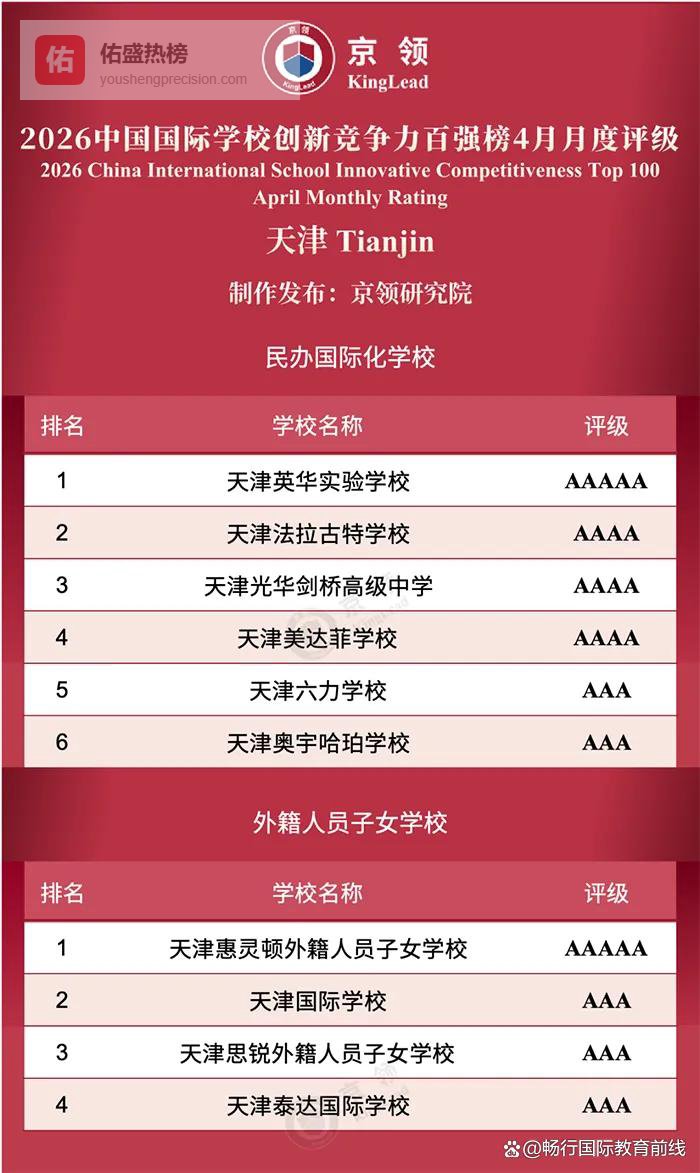 京领2026国际学校百强4月榜发布,天津10校强势登榜!