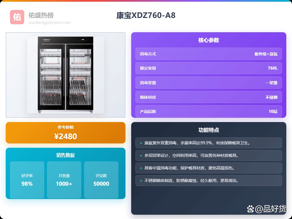 写在最后: 康宝立式消毒碗柜型号众多,功能各异,希望以上推荐的几款能给你提供一些参考。在选择时,多方比较,结合自身需求,相信你一定能找到一款安全、耐用、省心的消毒好帮手,为家人的健康保驾护航!